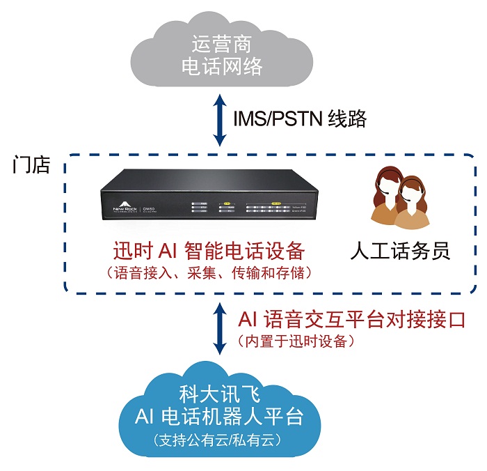在AI智能電話交互方案中,除了訊飛的AI智能語音機器人平臺,迅時的嵌入式、一體化AI智能電話設備發揮了不可或缺的重要作用。作為企業(門店)側的電話接入點,它不光提供傳統電話接口和IMS電話網絡接口,整合電話、錄音、人工坐席、本地電話和錄音存儲等多項業務;并通過語音處理、斷網緩存、斷點續傳等技術,提升語音機器人識別率,實現錄音零丟失。