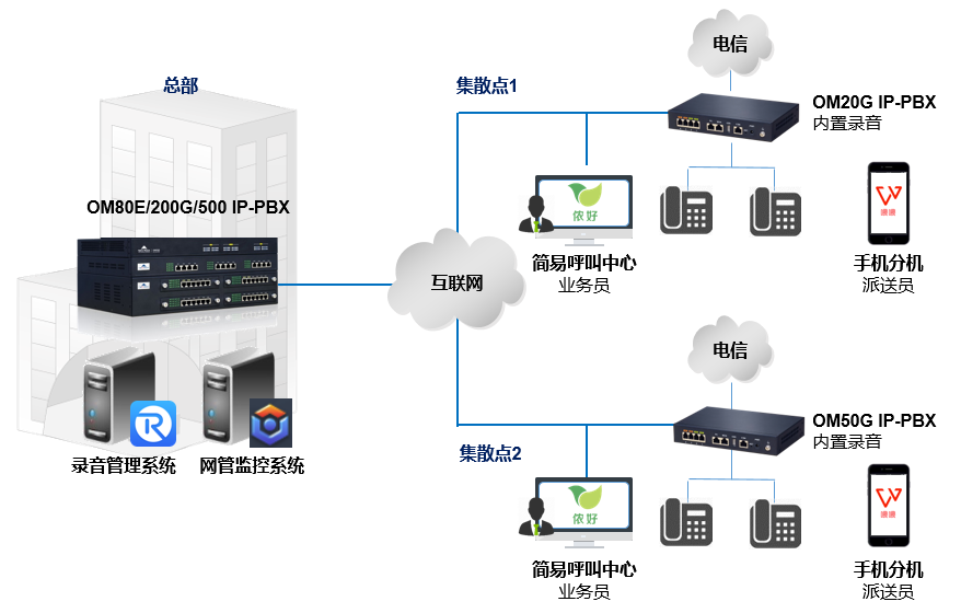 門店部署OM20G/50G IP-PBX,上連運營商PSTN/IMS線路,下接模擬/IP話機終端。