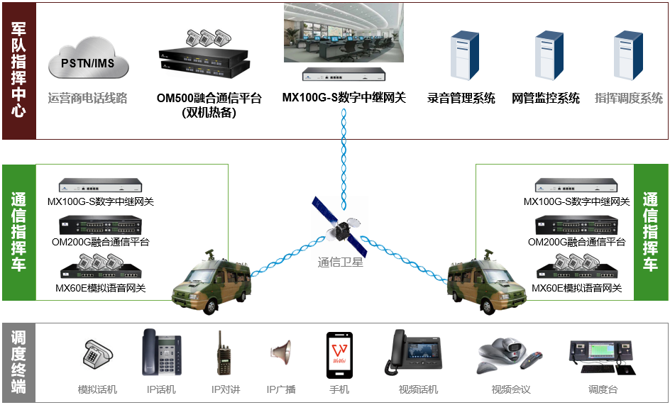 本方案基于IP語音組網技術,實現在軍隊指揮中心和通信指揮車之間的統一調度。適用于軍隊作戰、演習、常規備戰狀態下的語音通信和緊急調度。
