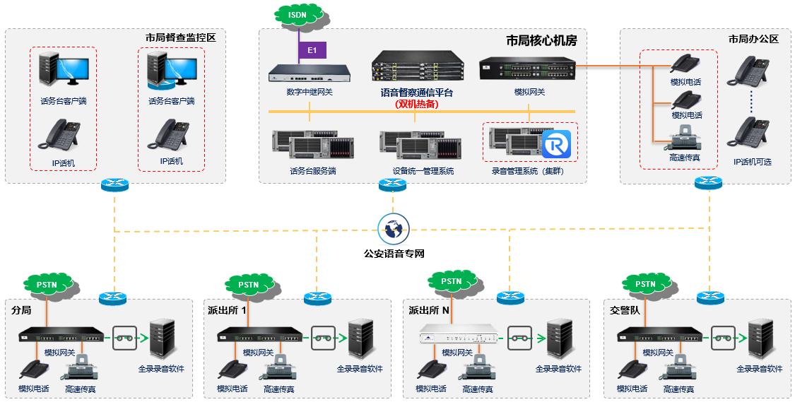 迅時語音督察通信平臺(IP-PBX)和語音網關,采用嵌入式專用硬件處理系統,能夠避免常見病毒、網絡攻擊和黑客入侵的行為;支持雙機熱備、雙電源/雙網口冗余、斷電/斷網逃生等高可靠性保障,確保語音通話“0”中斷。錄音文件支持本地督察平臺存儲,或實時/定時上傳至市或省級公安機關服務器統一集中備份存儲。