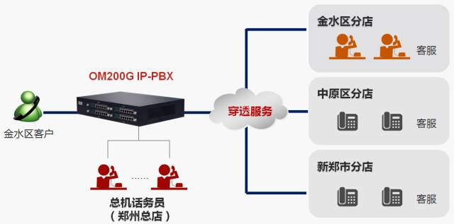 - OM200G系列IP電話系統放在鄭州總部,并配備5個總機號碼