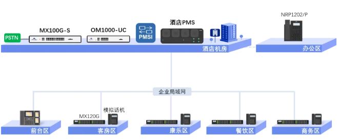 ·各樓層的客房、康樂、餐飲、商務中心區域部署模擬話機,通過各區域部署的語音網關統一注冊到OM1000-UC上,實現電話網絡統一通信