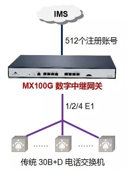 迅時數字中繼網關MX100G,支持1/2/4個E1接口、512個SIP中繼賬號注冊、雙電源雙網口冗余等特性,可以為30B+D設備接入運營商IMS平臺提供優質的解決方案。