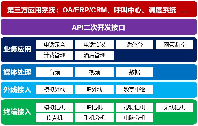 -  融合通信業(yè)務(wù):電話錄音、電話會議、電話組網(wǎng)、視頻通話、移動(dòng)分機(jī)、話務(wù)臺等。