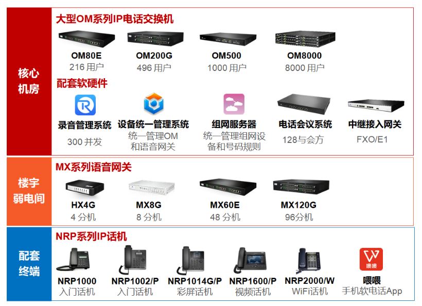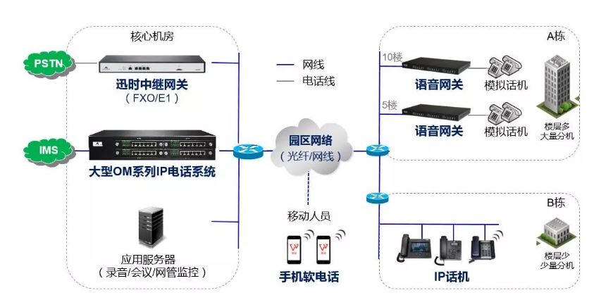 - 核心機房:部署大容量OM系列IP電話交換機(可選雙機熱備),用于本地運營商接入、園區所有語音網關、IP話機、移動辦公人員分機的注冊。可選部署應用服務器(如電話錄音管理系統、電話會議系統、網管監控系統等),用于集中管理各地設備和終端、以及電話業務。